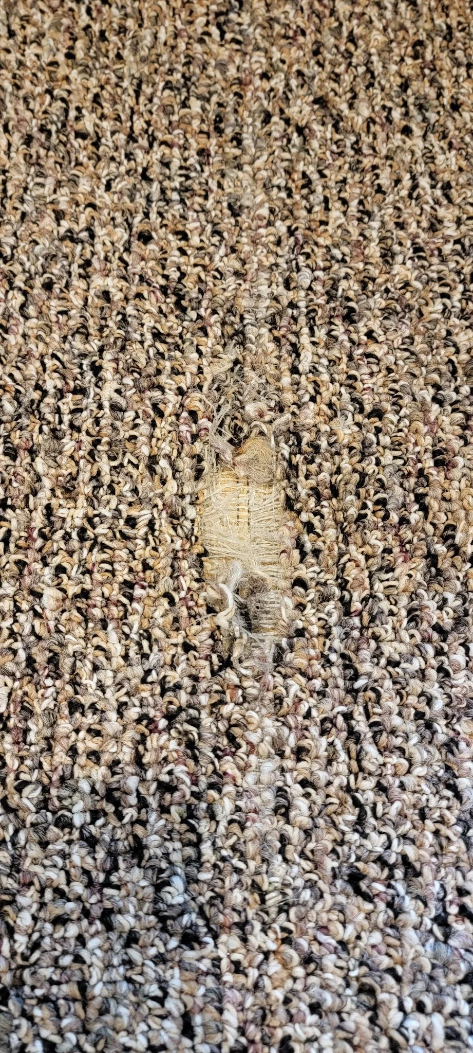 My client accidentally damaged this Berber carpet in the process of lifting it up, which was necessary due to a significant water leak that had occurred in the room.