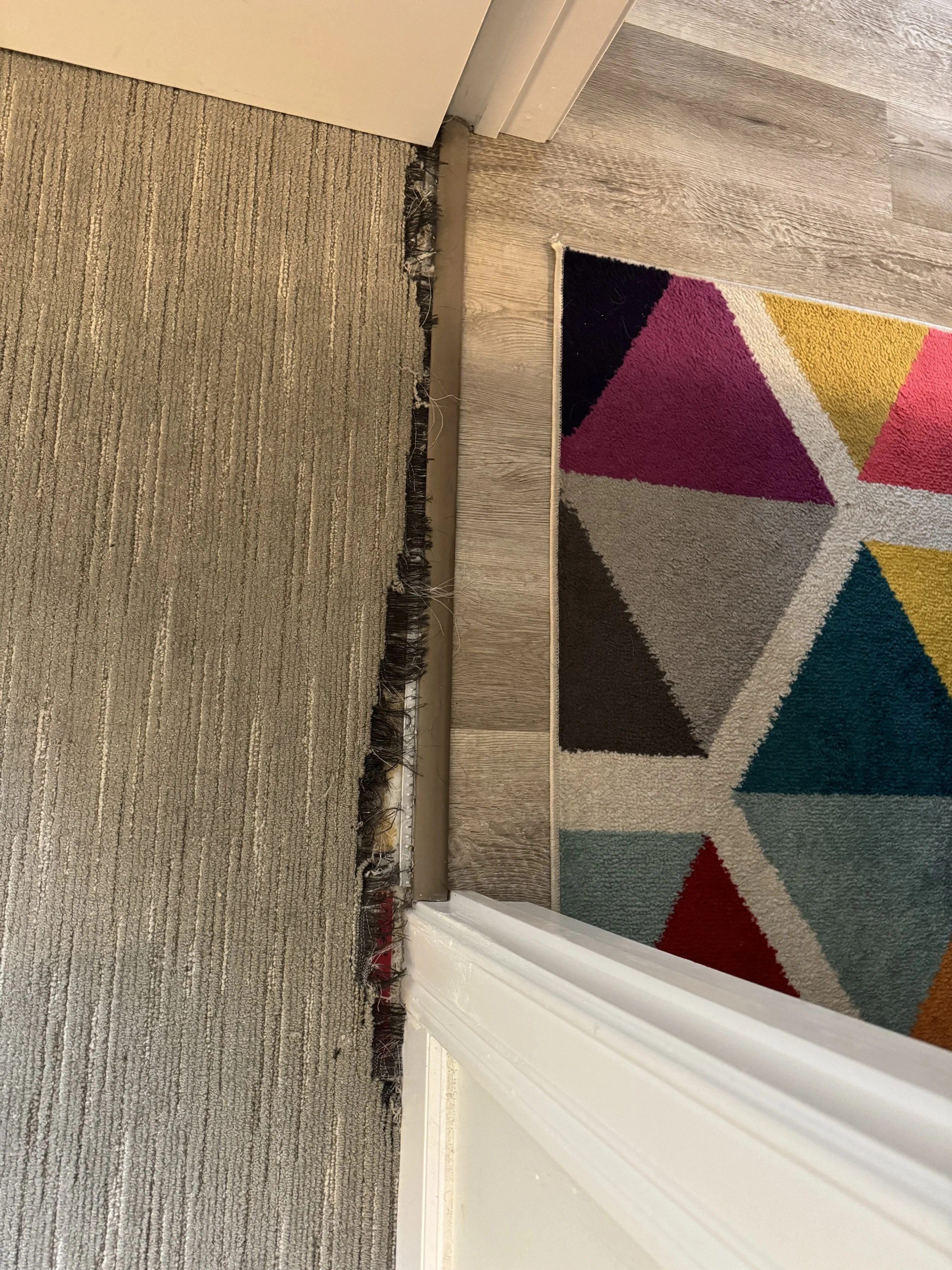 I was fortunate enough to successfully replace the damaged section of carpet with a remnant that my client thoughtfully saved from the original installation. This not only preserved the aesthetic continuity of the space but also allowed for a seamless repair that matched the existing flooring beautifully.
